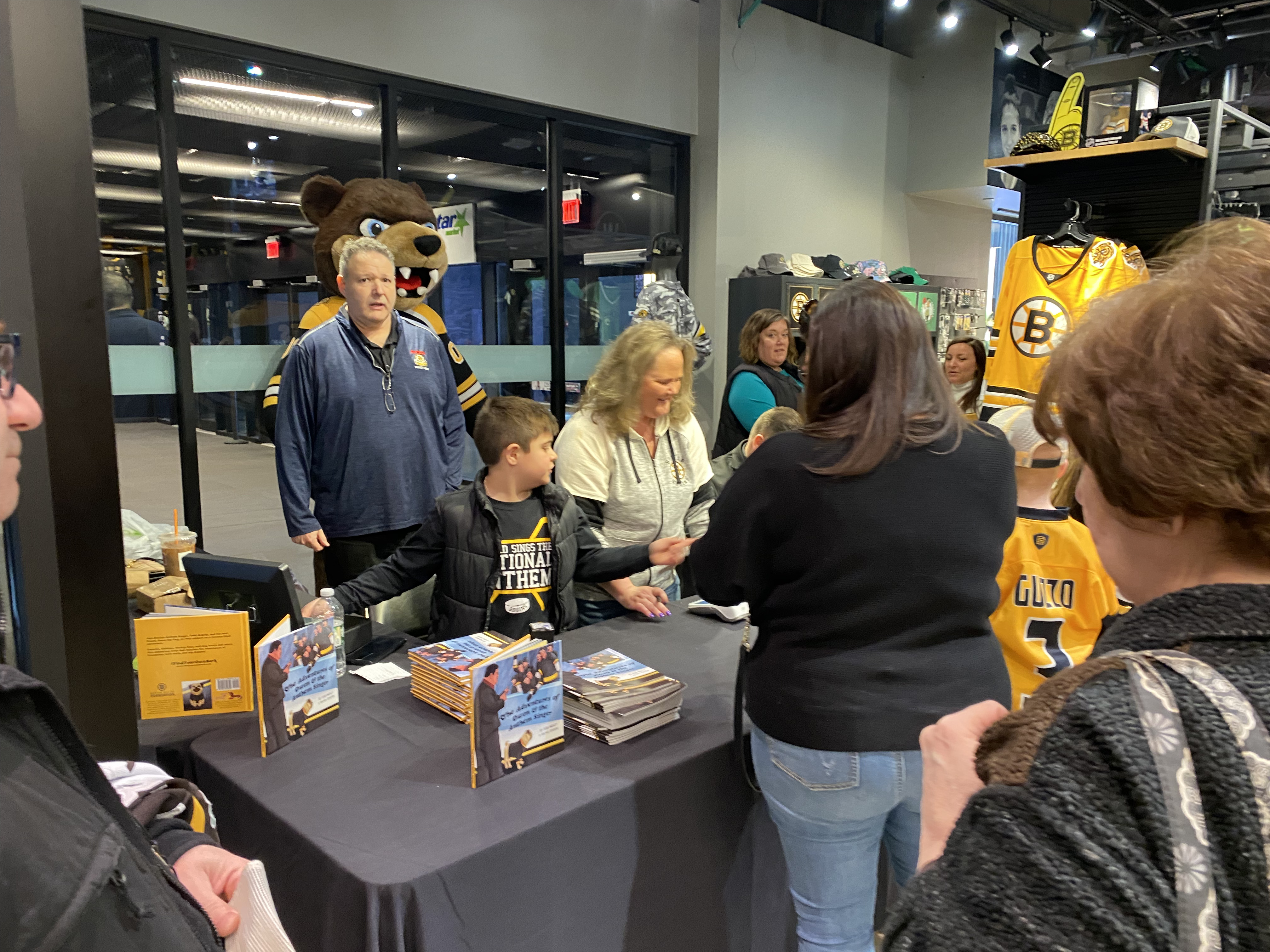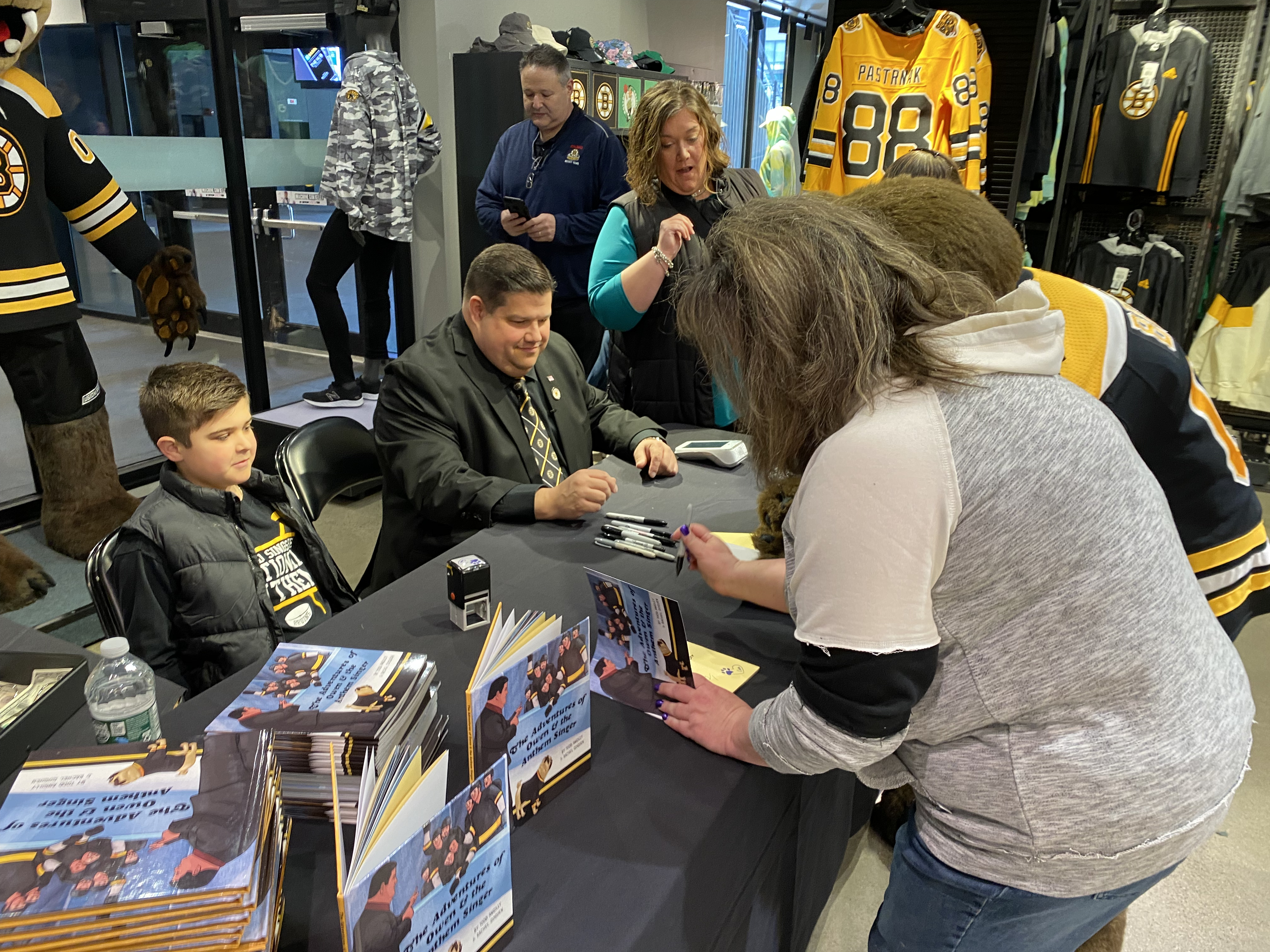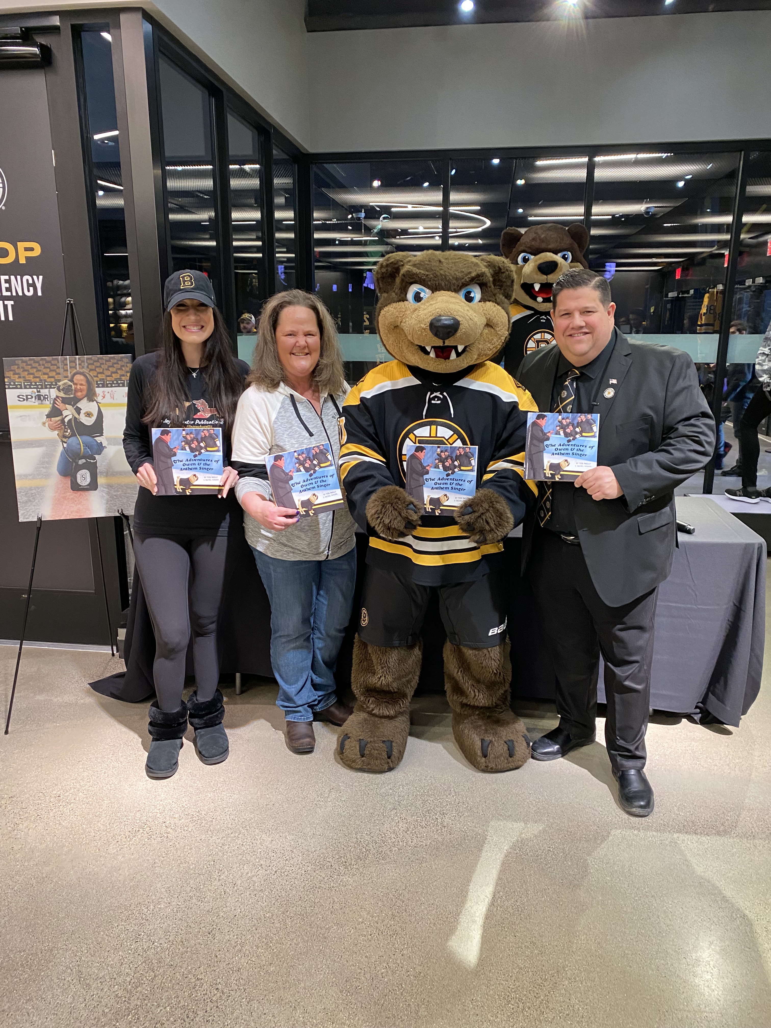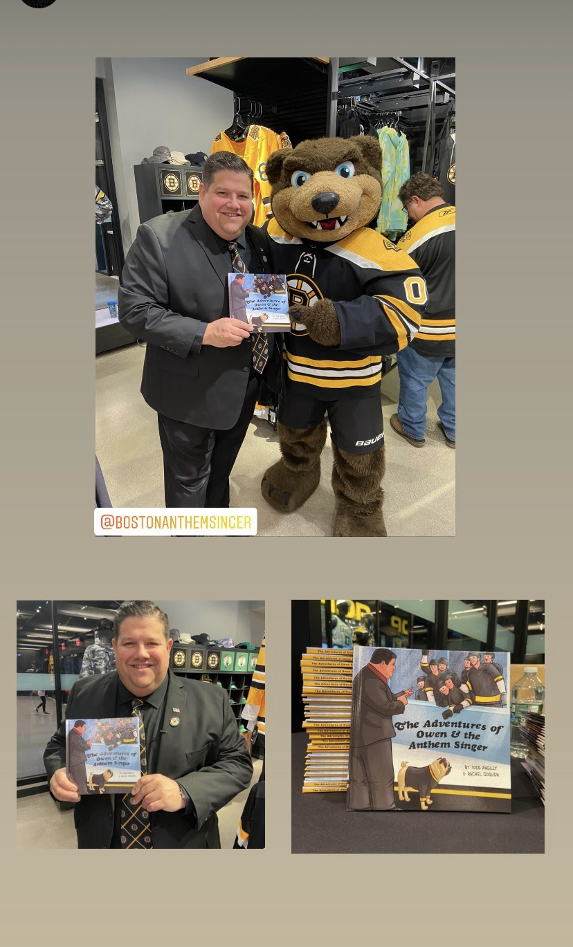 On Saturday March 26, 2022, the Boston Bruins Pro Shop hosted a special event to celebrate the release of Boston Anthem Singer Todd Angilly and Rachel Goguen’s new children’s book, The Adventures of Owen & the Anthem Singer. Hundreds of Bruins fans attended. Todd and Rachel signed books and Bruins alumnus Bob Sweeney read the story aloud. Special guests also included the Bruins mascot Blades!