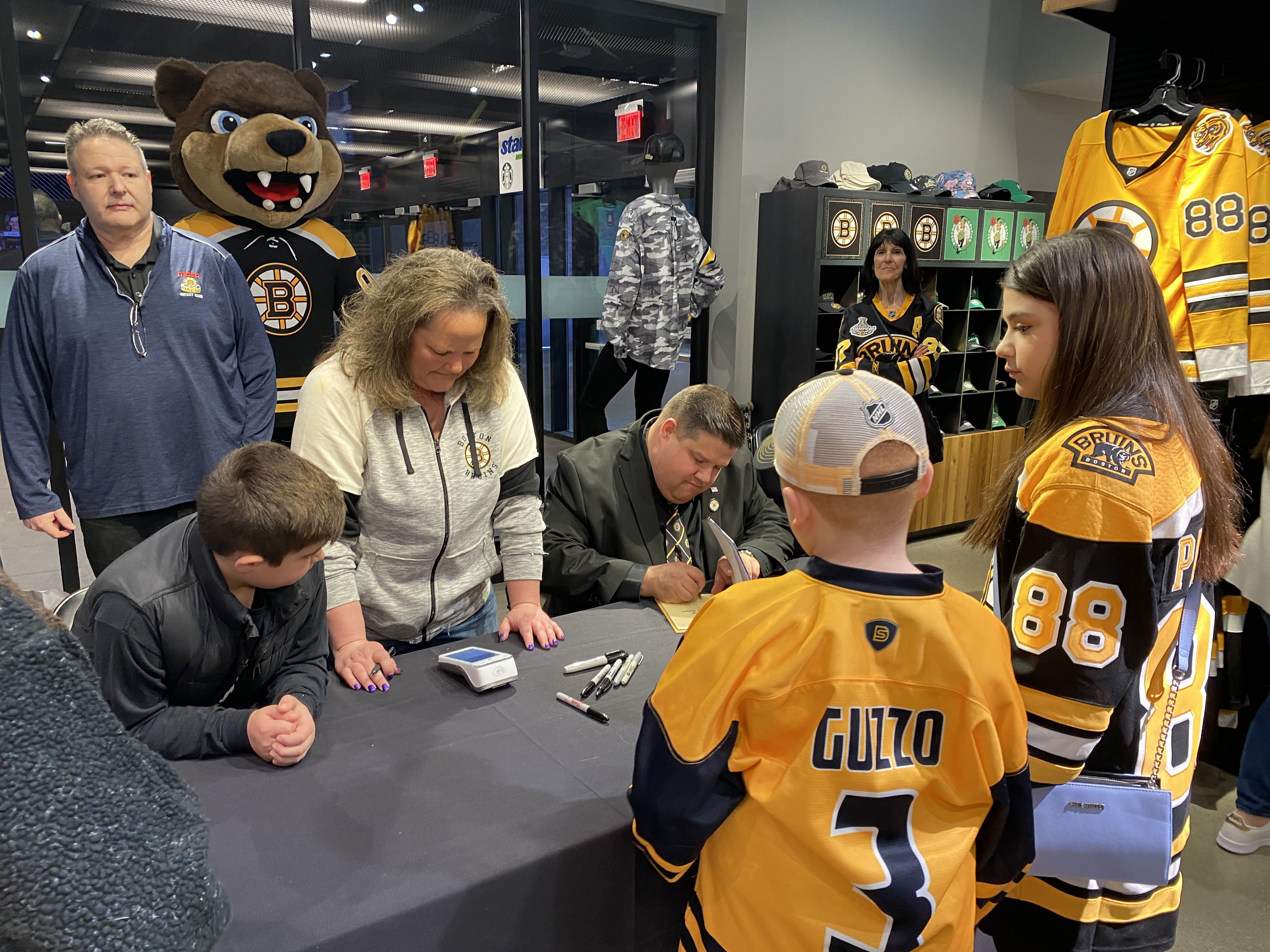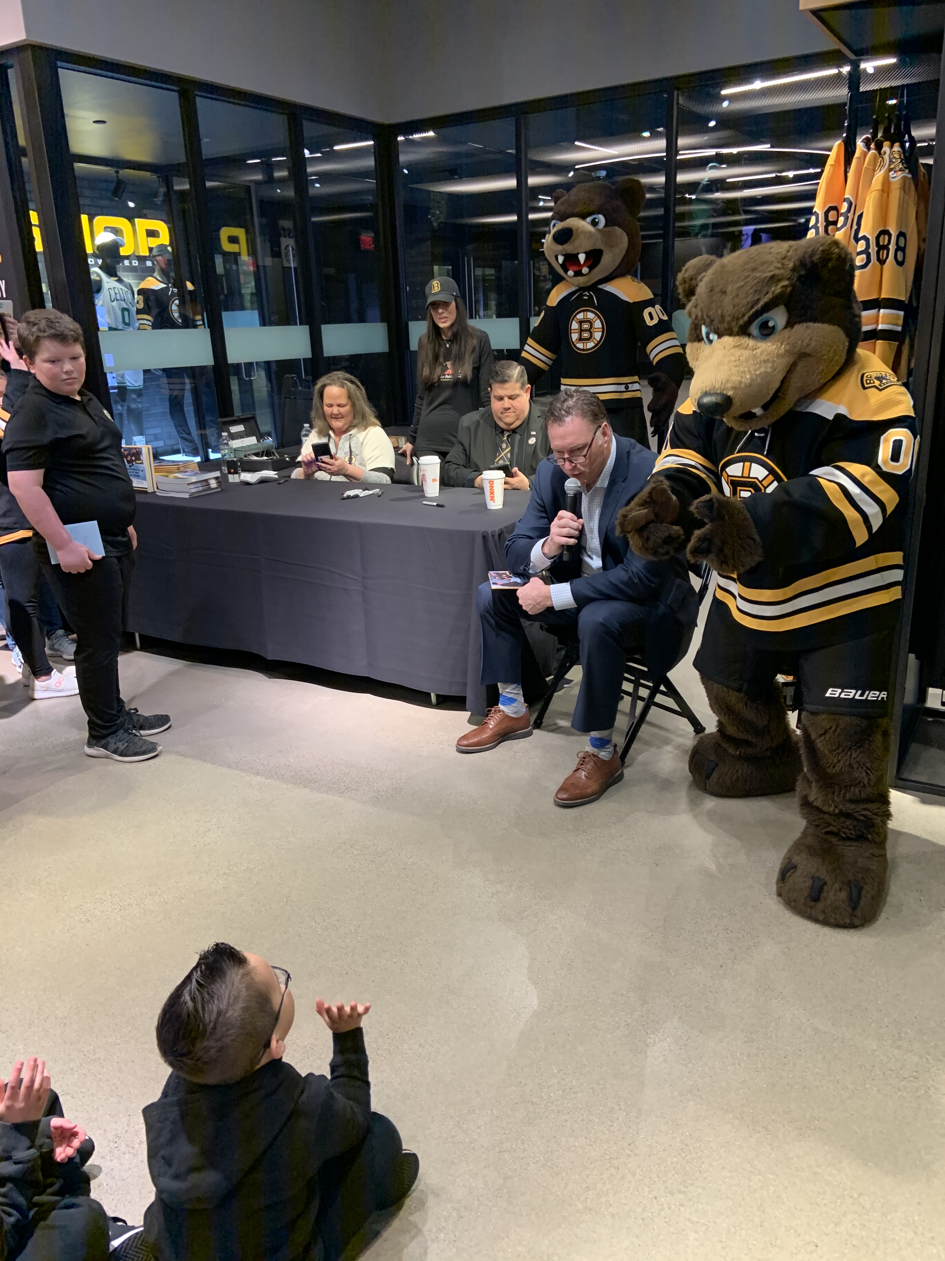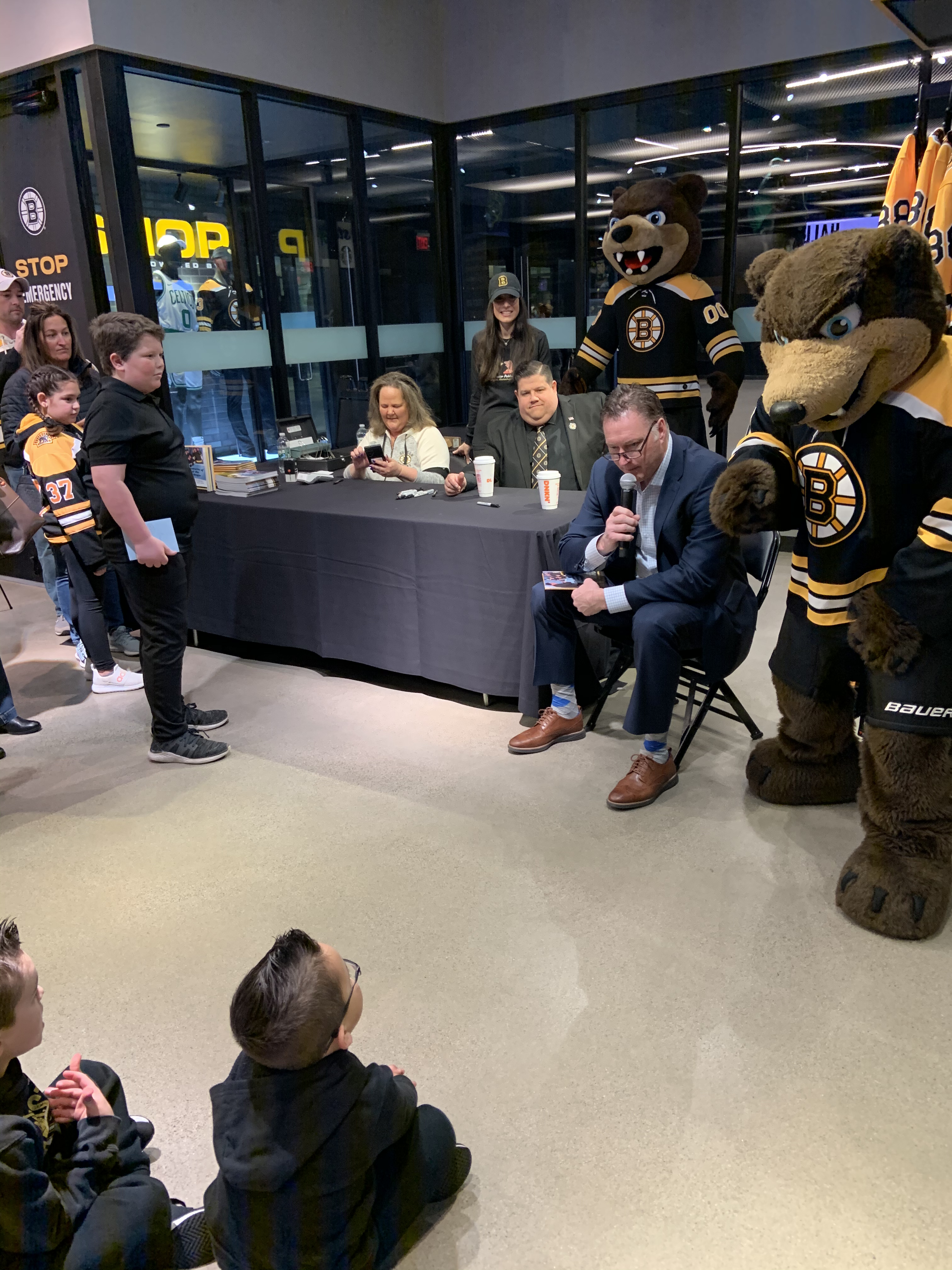 On Saturday March 26, 2022, the Boston Bruins Pro Shop hosted a special event to celebrate the release of Boston Anthem Singer Todd Angilly and Rachel Goguen’s new children’s book, The Adventures of Owen & the Anthem Singer. Hundreds of Bruins fans attended. Todd and Rachel signed books and Bruins alumnus Bob Sweeney read the story aloud. Special guests also included the Bruins mascot Blades!