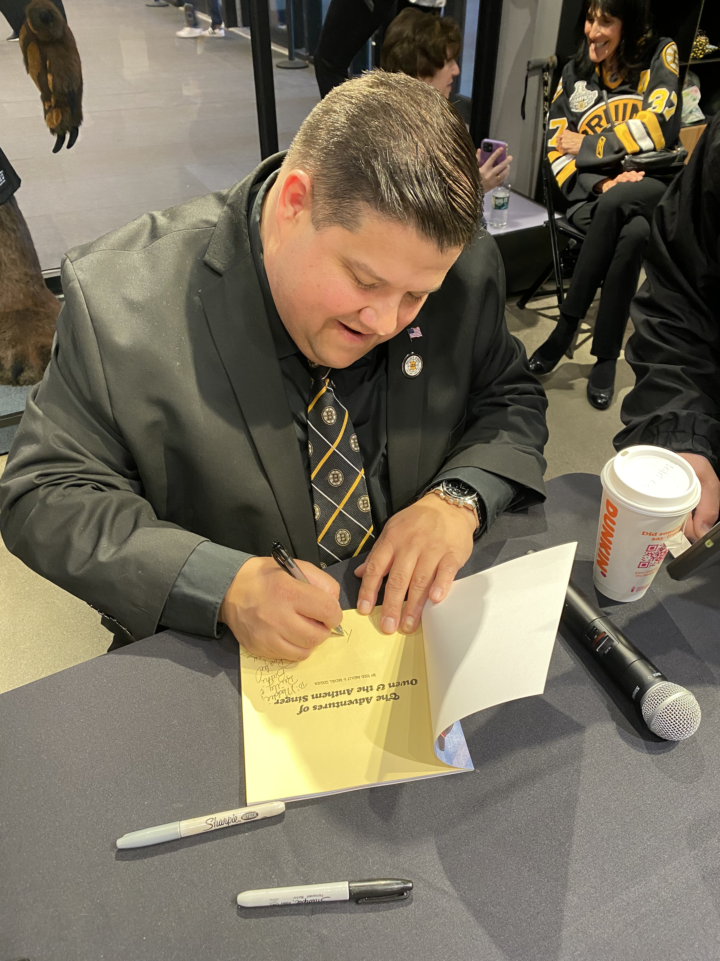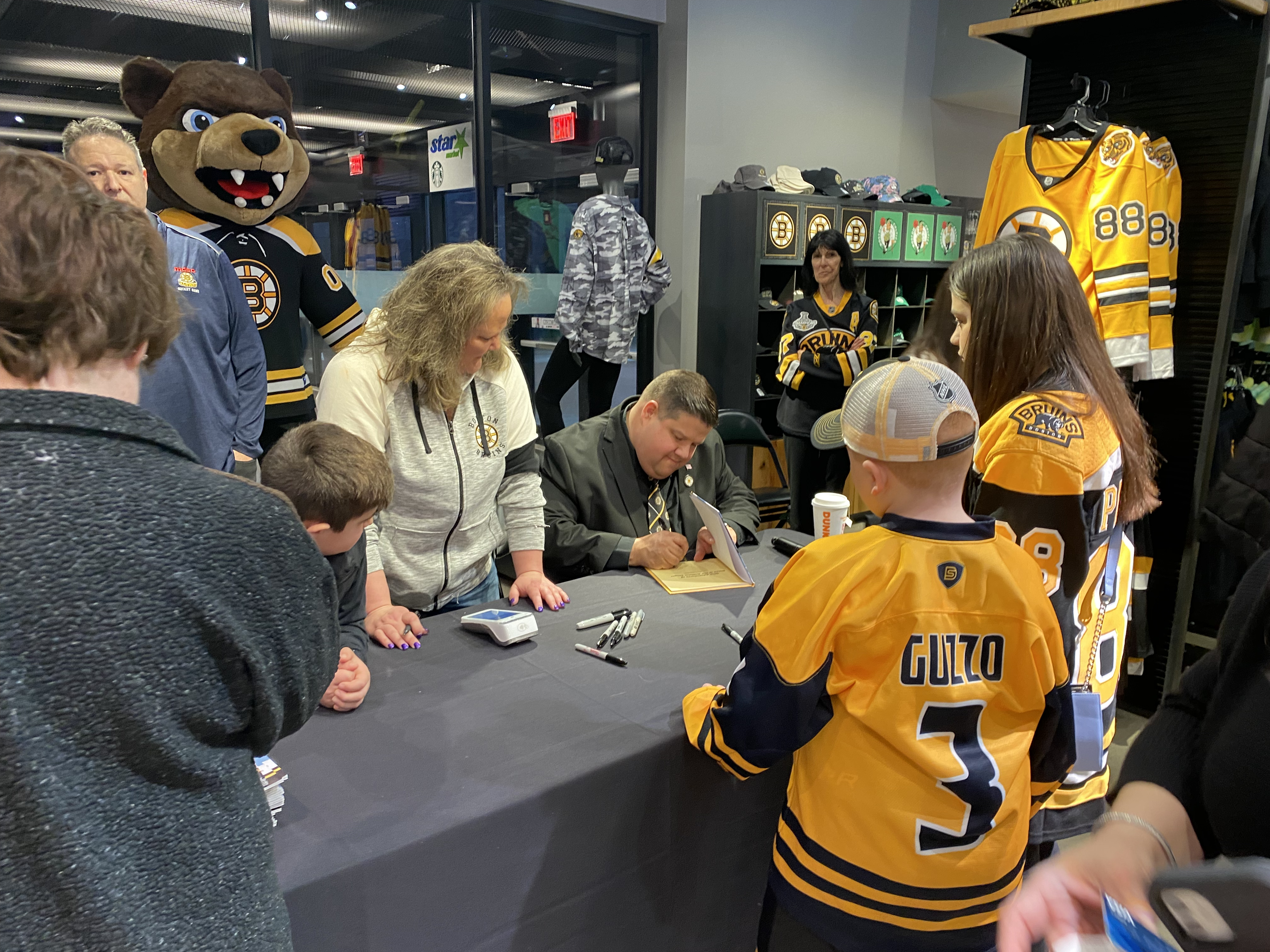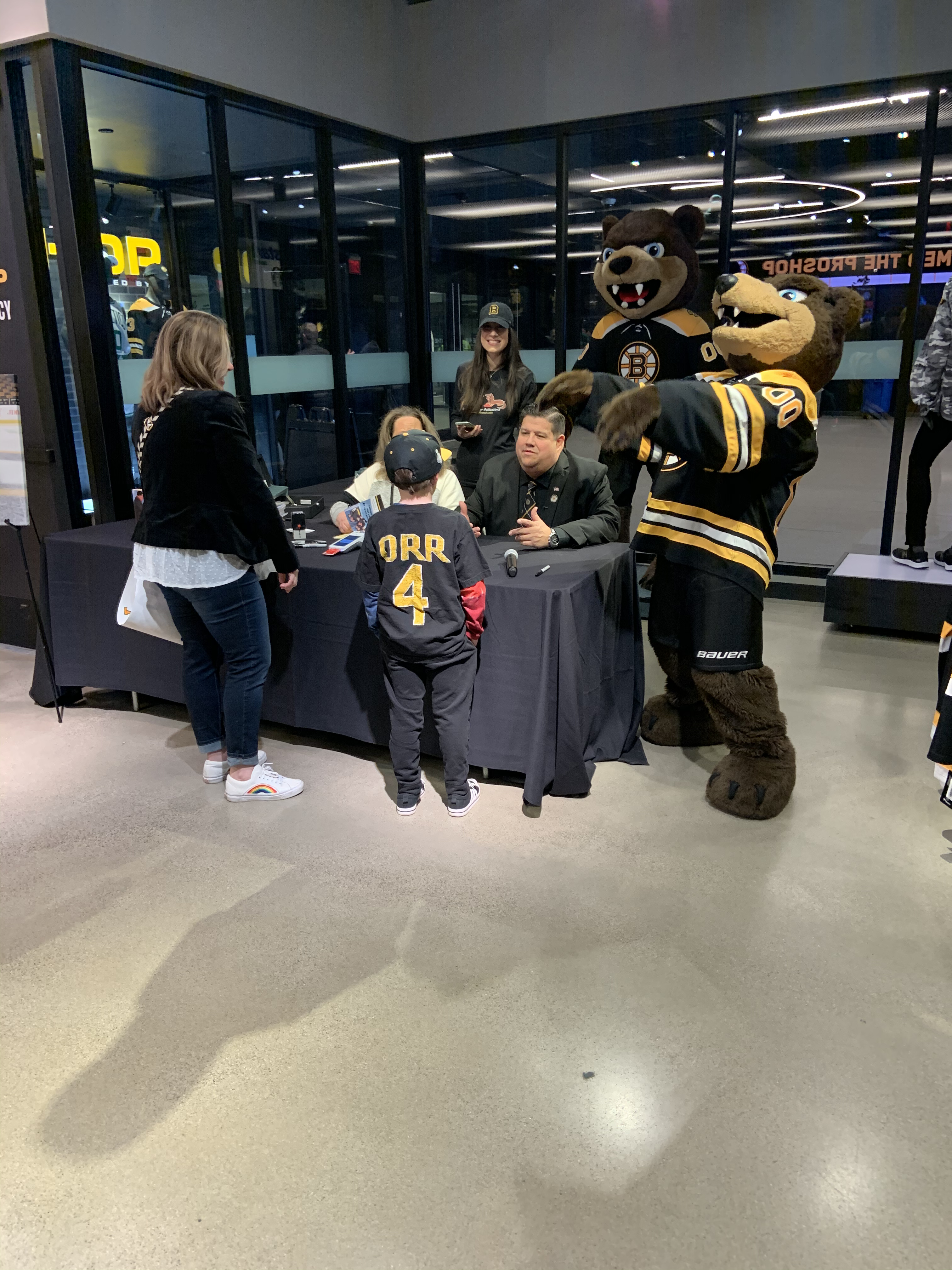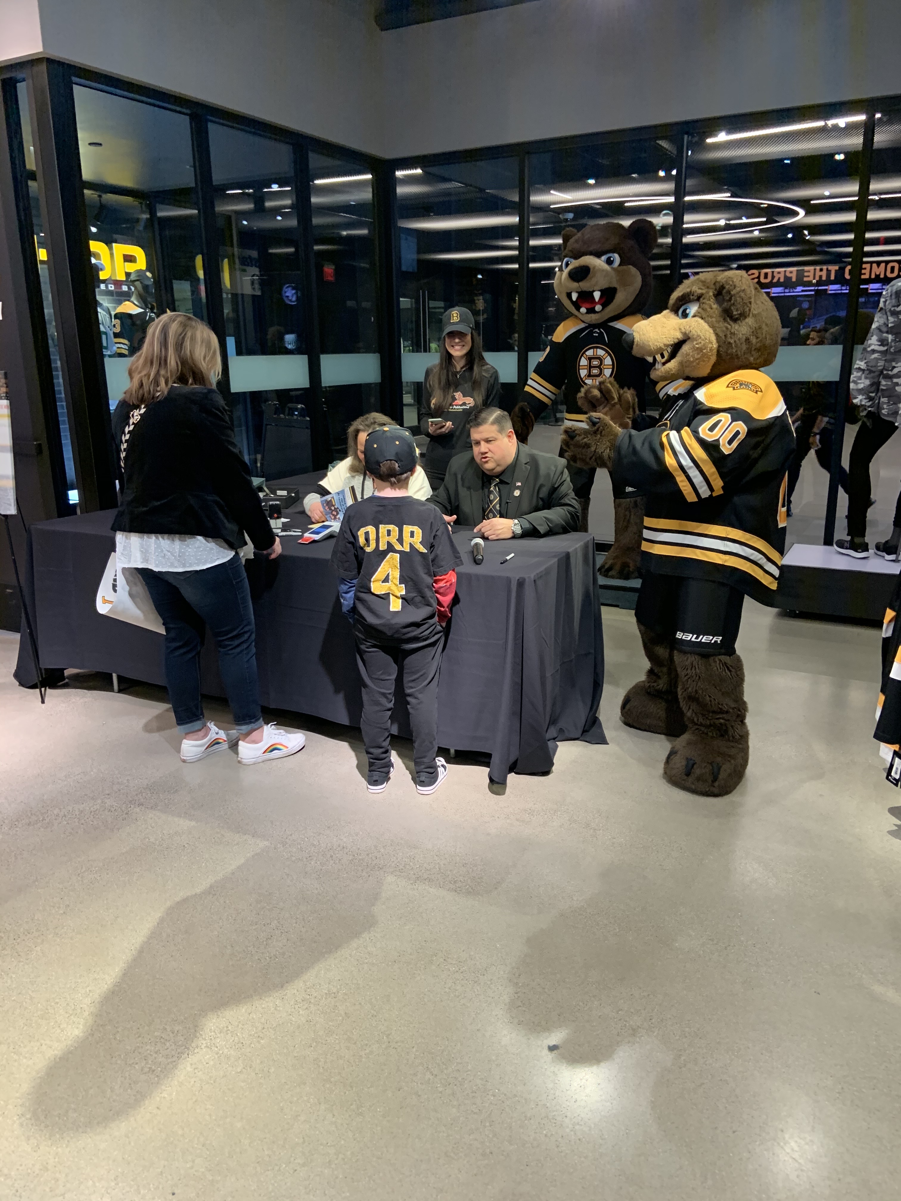On Saturday March 26, 2022, the Boston Bruins Pro Shop hosted a special event to celebrate the release of Boston Anthem Singer Todd Angilly and Rachel Goguen’s new children’s book, The Adventures of Owen & the Anthem Singer. Hundreds of Bruins fans attended. Todd and Rachel signed books and Bruins alumnus Bob Sweeney read the story aloud. Special guests also included the Bruins mascot Blades!