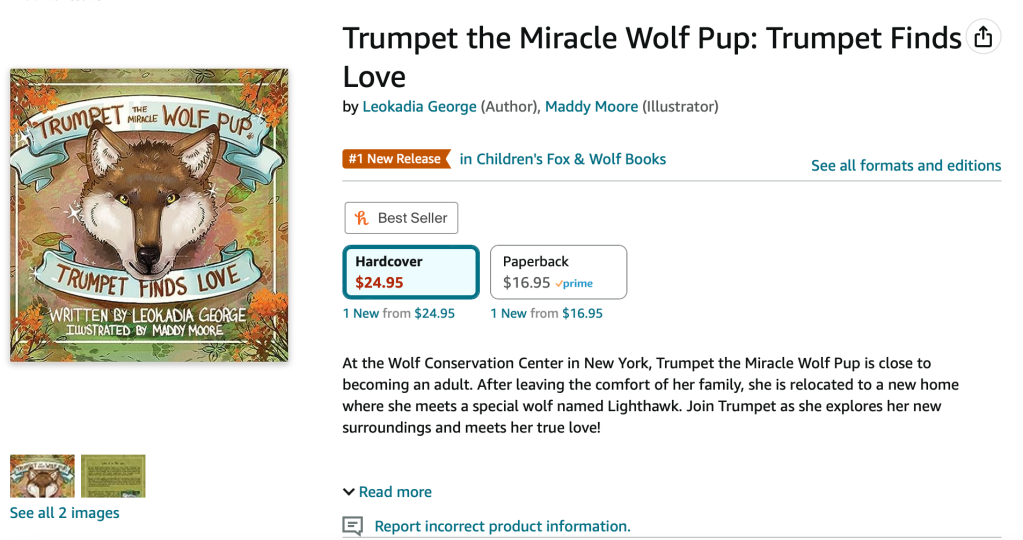 “I bought this book for myself, a supporter of reintroducing wolves back into the wilderness. It is a delightful story about an alpha pair of wolves at the wolf center in New York. The center was trying to breed them. No spoiler here. The illustrations are soft and sweet, and the story is uplifting . I recommend this book. It’s a neat story, and proceeds support the wolf center in New York.” – Abby S., Amazon Reviewer
